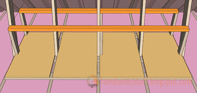 Next bring up your precut bottom shelves and slip them in between the purlin supports as snown.